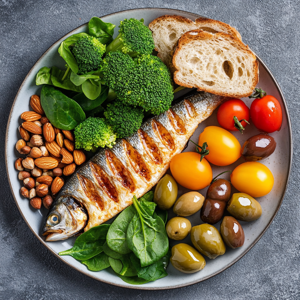 - Fats: Omega-3-rich fish, avocado, olives, and olive oil.